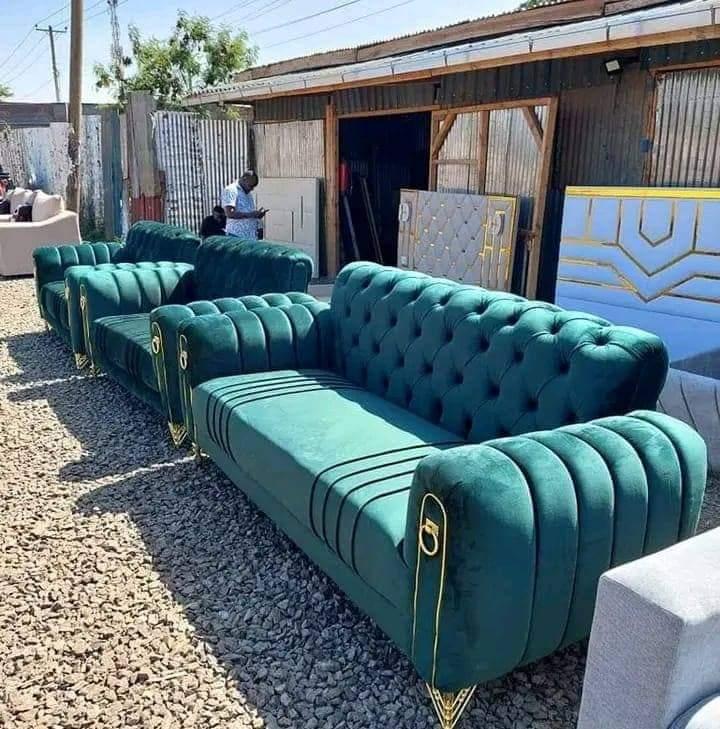 Stunning 6 seater tufted sofa collection featuring deep emerald green velvet upholstery with elegant button-tufted detailing. This modern Chesterfield-style living room set showcases bold horizontal channel ribbing on arms and sides, accented with sophisticated gold piping and decorative gold feet. Key Features: Deep button tufting for classic elegance Rich emerald/teal green velvet fabric Gold metallic trim and accents Contemporary Chesterfield design Plush cushioned seating Statement furniture piece Set Includes: 3-seater sofa + 2 seater + 1 single Perfect for luxury home decor, upscale living rooms, or boutique hotel lounges. This eye-catching furniture set combines traditional craftsmanship with modern glamour. Premium emerald green velvet sofa set with gold accents. Deep button tufting, channel design. Luxury Chesterfield-style living room furniture. Shop now.