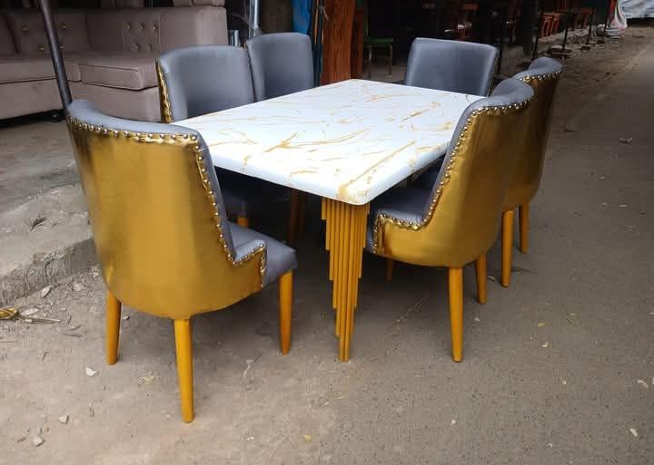 Elevate your dining experience with this 6-Seater Marble Dining Table Set from Sofa Hub Kenya, crafted with a perfect balance of elegance and durability. Designed in Karen, Nairobi, this dining set features a sleek white marble tabletop with gold streaks, beautifully paired with gold and grey upholstered chairs for a modern, luxurious look. The high-quality marble finish adds sophistication to your dining space, while the padded chairs ensure exceptional comfort for family meals or guest entertaining. The gold detailing on the chair frames and legs enhances its premium appearance, making it a standout centerpiece for any Kenyan home. Ideal for both contemporary and classic interiors, this set brings a sense of luxury and refinement to your dining area. Key Features: 6-seater design – perfect for family dining or entertaining guests Elegant white marble top with gold accents Comfortable grey and gold upholstered chairs with nailhead trim Strong, durable wooden legs for stability and longevity Premium modern design crafted in Karen, Nairobi Easy to clean and maintain Ideal for homes, restaurants, and luxury apartments Why Choose Sofa Hub Kenya At Sofa Hub, we specialize in handcrafted, high-quality furniture that blends modern design with Kenyan artistry. Located in Karen, Nairobi, we offer custom-made furniture, affordable prices, and delivery across Kenya to make luxury living accessible to everyone
