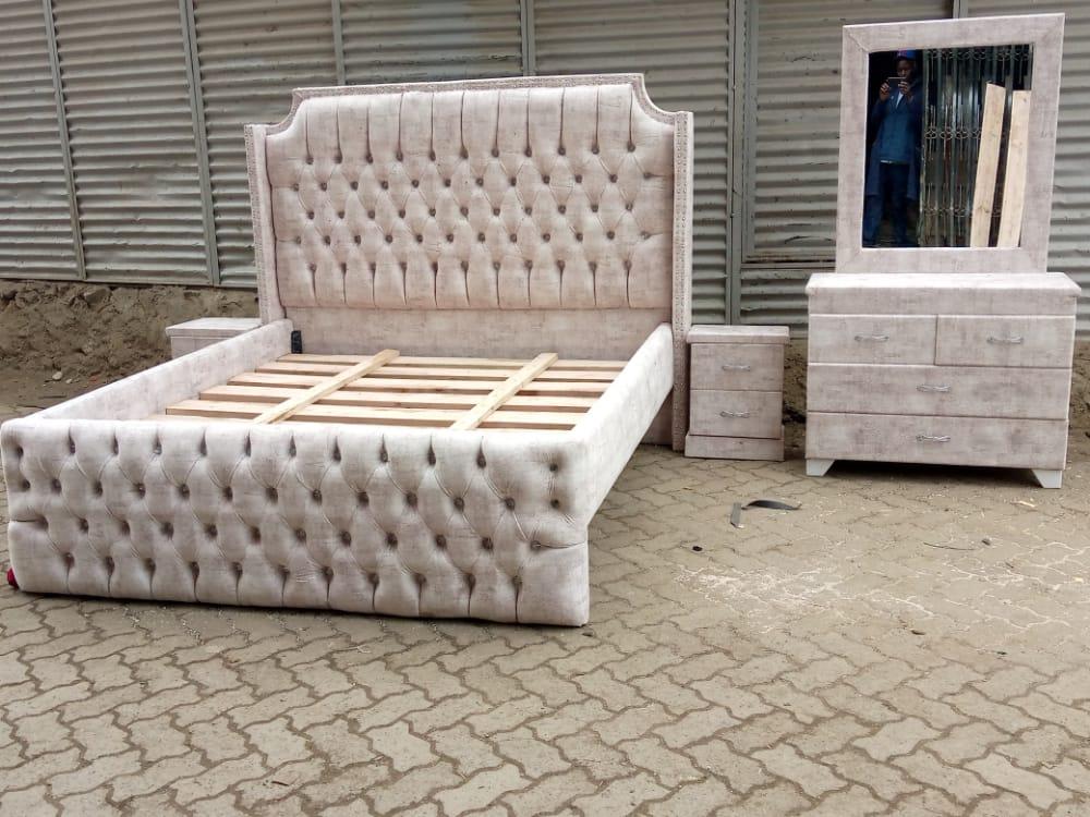 This luxurious 6x6 complete bedroom set features an elegant cream/beige tufted bed with matching dresser and mirror. The sophisticated ensemble creates a cohesive, hotel-inspired look perfect for spacious master bedrooms. Set Includes: 6x6 King-size upholstered bed with deep button tufting Matching dressing table/dresser with 6 spacious drawers Large framed dressing mirror with elegant border detail Bedside nightstand with storage drawers Key Features: Premium velvet or linen-look upholstery in neutral cream tone Luxurious diamond tufting on headboard, footboard, and side rails Solid wood slat support system (visible in photo) Elegant nailhead trim detailing Matching crushed velvet finish on dresser Crystal/chrome drawer handles Sturdy hardwood construction throughout Easy-care, stain-resistant fabric
