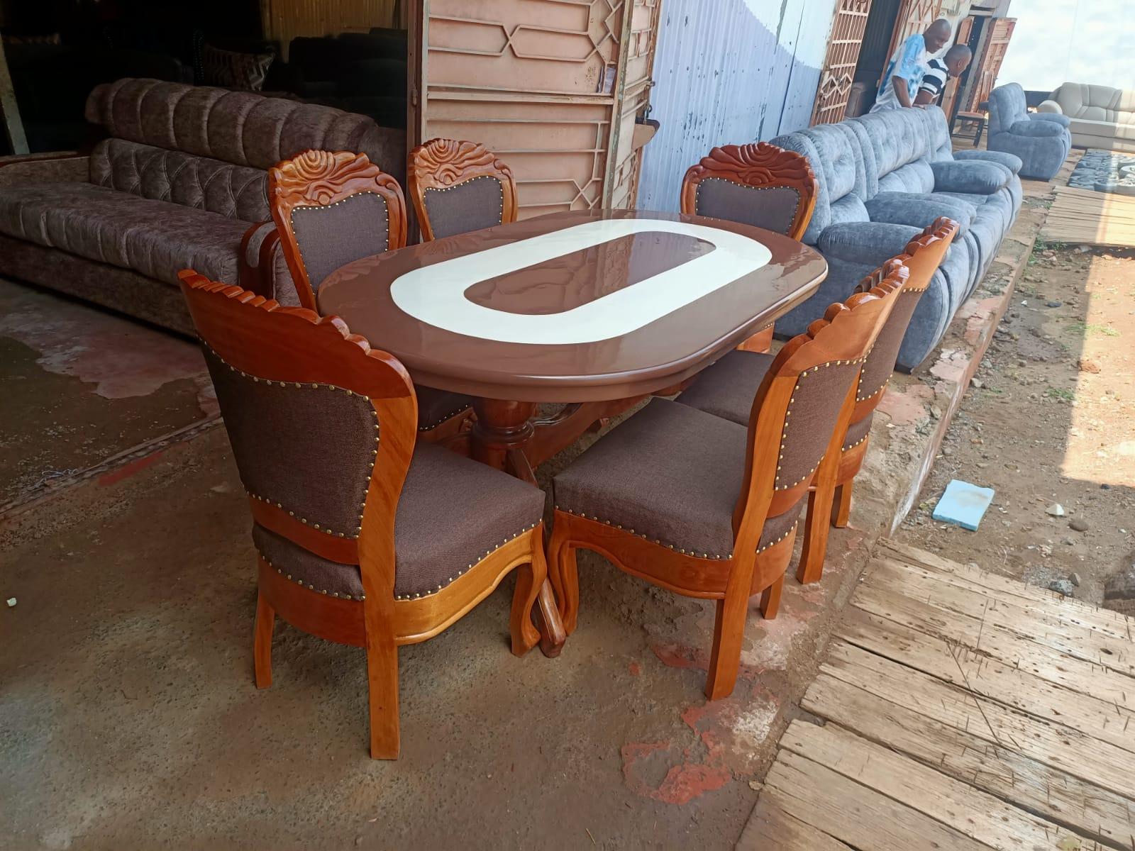 This stunning 6-seater oval dining set combines classic elegance with modern durability. The table features a unique two-tone marble resin top with a distinctive white border and brown center inlay, offering exceptional heat and scratch resistance for everyday use. Key Features: Premium mahogany wood construction with rich honey-tone finish Marble resin tabletop - heat-resistant and scratch-resistant for long-lasting beauty Six ornate antique-style chairs with carved decorative backs Brown upholstered seats with decorative brass nail head trim Turned pedestal base with elegant detailing Perfect for formal dining and special occasions Oval dining table Nairobi Mahogany dining set Langata Road Marble top dining table Kenya 6 seater dining set Nairobi Antique style dining chairs Kenya Heat resistant dining table Nairobi Scratch resistant dining furniture Luxury dining sets Langata Wooden dining table Nairobi Kenya Designer dining furniture Nairobi Dining room sets near me Langata Quality furniture shops Nairobi Affordable luxury dining tables Kenya Classic dining sets Nairobi Location: Langata Road, Nairobi, Kenya Perfect for Kenyan homes seeking timeless sophistication with practical, low-maintenance functionality