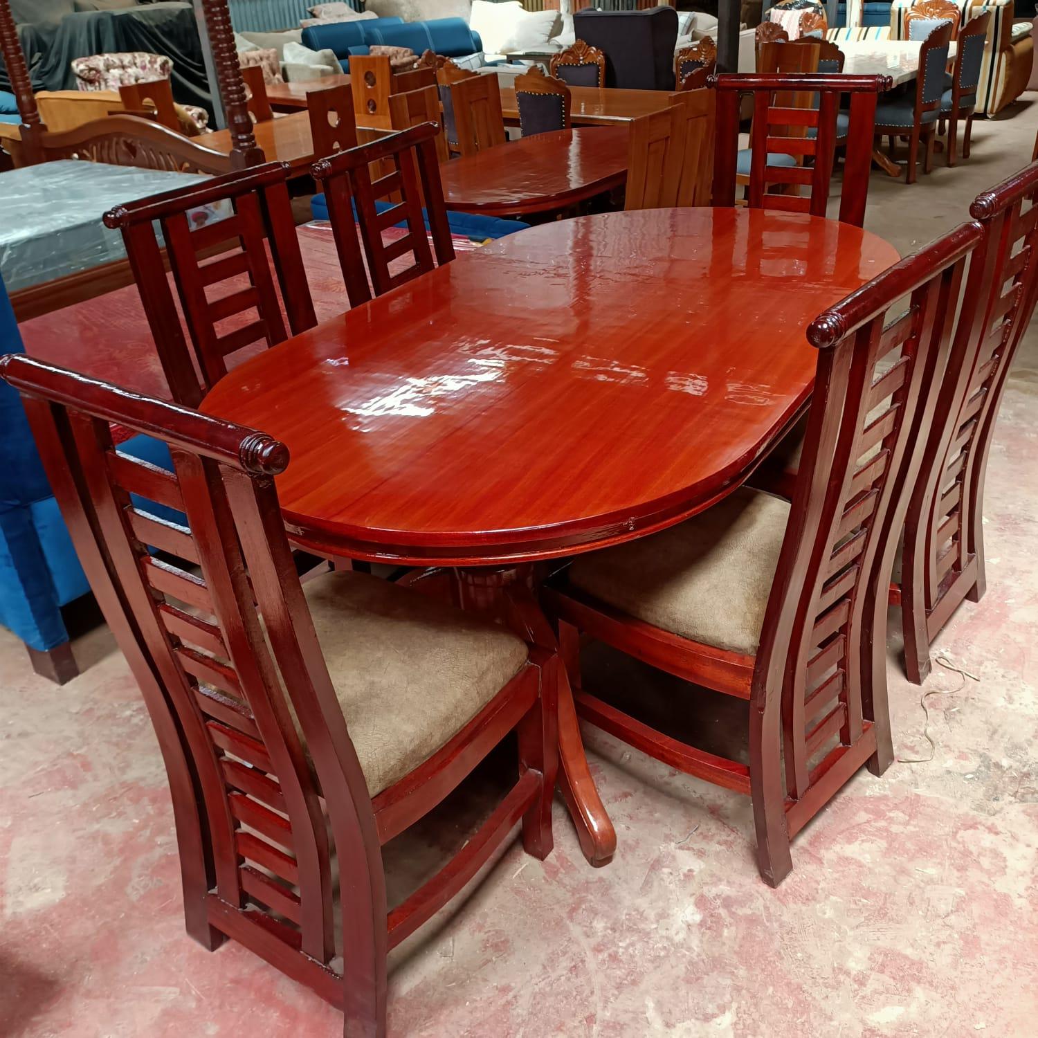 This elegant Eltiki dining set features a beautiful oval/boat-shaped table with an simple design and 6 matching chairs. The entire set is crafted from premium solid mahogany wood with a rich, glossy reddish-brown finish that showcases the natural wood grain. Key Features: Table has gracefully curved edges and decorative carved legs with scroll details Six high-back chairs with horizontal slat designs and cushioned beige seats Sturdy construction ideal for family dining and entertaining Polished lacquer finish for durability and easy maintenance