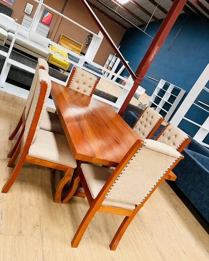 Elevate your dining experience with this exquisite pure hardwood mahogany dining set, expertly handcrafted at Sofa Hub Kenya, Karen. This stunning furniture piece combines traditional craftsmanship with contemporary elegance, featuring luxurious upholstered chairs with classic Chesterfield design details. Key Features: 100% Pure Mahogany Hardwood - Premium solid wood construction Handcrafted in Karen, Kenya at Sofa Hub Kenya's expert workshop Rich mahogany finish with natural wood grain beauty Elegant Chesterfield-style chairs with button-tufted backrests Coccus fabric upholstery for a sophisticated, elegant touch Cream/beige cushioned seats with decorative studding Sturdy construction built to last generations Timeless design that complements both classic and modern interiors Craftsmanship Excellence: Each piece is meticulously handcrafted by skilled artisans at our Karen showroom, ensuring superior quality and attention to detail. The combination of solid mahogany wood and premium upholstery creates a dining set that's both functional and a statement piece. Perfect For: Family dining rooms, formal entertaining spaces, upscale restaurants, executive homes, and anyone who appreciates fine Kenyan craftsmanship and luxury furniture. Why Choose Sofa Hub Kenya: Located in Karen, Nairobi, we specialize in creating bespoke, handcrafted furniture using the finest materials. Our mahogany dining sets represent the pinnacle of Kenyan furniture-making tradition combined with contemporary design sensibilities. Visit Sofa Hub Kenya, Karen - Where Quality Meets Craftsmanship