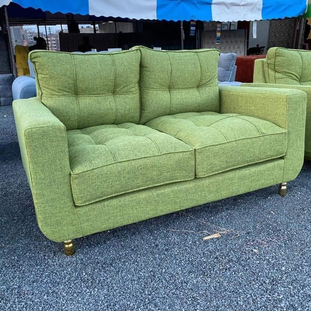 Vibrant lime green 2-seater sofa featuring contemporary tufted cushion design with elegant gold metal legs. Perfect for modern Kenyan homes, apartments, and offices seeking a fresh, stylish look.Key Features: Bright lime green linen-textured fabric Tufted seat and back cushions Wide comfortable armrests Gold/brass metal legs with casters Compact 2-seater design Customizable in any color Durable hardwood frame Easy-clean upholstery Space-saving design Ideal For: Small apartments in Nairobi Studio flats Bedsitters and one-bedroom homes Office reception areas Airbnb properties Kenya Modern living rooms Available Colors: Lime green, grey, blue, beige, yellow, orange, or any custom colorFree Delivery: Nairobi, Kiambu, Machakos & major towns across Kenya