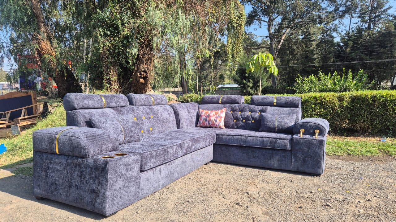 Upgrade your living room with this stylish L-shaped 6-seater sofa, complete with 3 throw pillows and a pouffe. Handcrafted in Kenya with premium fabric and elegant gold accents. Available in any color of your choice. Enjoy free delivery within Nairobi and affordable custom options.The sofa measures 7ftx9ft long.