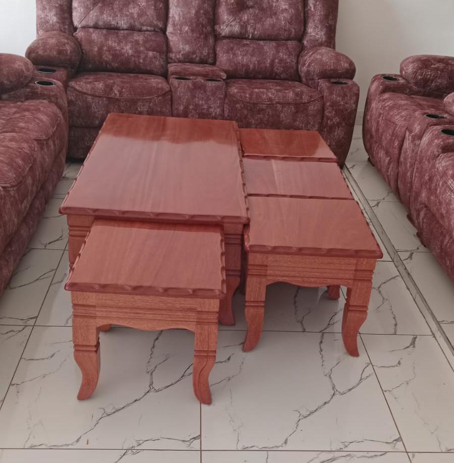 Discover timeless elegance with this exquisite 4-piece mahogany stools and coffee table. Handcrafted from 100% pure mahogany hardwood by Sofa Hub Kenya, these versatile tables combine traditional craftsmanship with space-saving functionality, perfect for any Kenyan home. Key Features: Premium Solid Mahogany Wood: Crafted entirely from genuine mahogany timber, renowned for its durability, rich color, and beautiful natural grain 3-Piece Nesting Set: Includes three tables of graduated sizes that nest perfectly together or can be used separately throughout your home Elegant Curved Legs: Traditional cabriole-style legs with decorative apron detailing showcase expert woodworking craftsmanship Versatile Configuration: Use together as a layered display, separate for flexible entertaining, or place in different rooms as needed Space-Saving Design: Nest together to save floor space in smaller sitting rooms and apartments Rich Natural Finish: Deep mahogany stain highlights the wood's natural beauty and grain patterns Sturdy Construction: Solid wood joinery ensures stability and longevity for generations Multi-Functional: Perfect as coffee tables, side tables, end tables, or plant stands Perfect For: Living rooms and sitting rooms in Nairobi, Mombasa, Kisumu, Nakuru, Eldoret, Thika Apartments and homes across Kenya seeking flexible furniture solutions Traditional, classic, and contemporary interior styles Entertaining guests with multiple surface options Small spaces requiring versatile, space-saving furniture Those who appreciate authentic hardwood craftsmanship Specifications: Material: 100% Pure Mahogany Hardwood Set: 4 stools and 1 table Style: Traditional/Classic with curved legs Finish: Natural mahogany stain with protective coating Why Choose Sofa Hub: These mahogany nesting tables represent exceptional value and authentic quality. Each piece is handcrafted by skilled Kenyan artisans using traditional techniques, ensuring you receive furniture that's built to last and becomes a cherished part of your home. Free delivery in Nairobi. Nationwide delivery available to Mombasa, Kisumu, Nakuru, Eldoret, Machakos, Kitale, and all towns across Kenya.