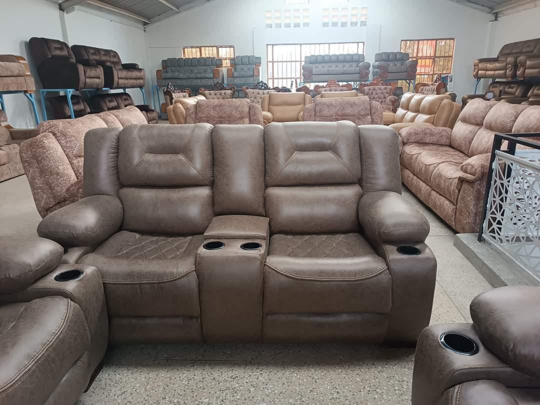 Experience ultimate relaxation with this luxurious 7-seater recliner sofa set, handcrafted at Sofa Hub Kenya, Karen. Featuring plush faux leather upholstery in sophisticated grey-brown tones, built-in cup holders, and full reclining functionality, this complete living room collection delivers cinema-style comfort to your home. Key Features: 7-seater complete set - 3-seater semi recliner sofa, 2-seater console loveseat, and 2 single semi recliners Built-in cup holders - Convenient drink holders on console and side armrests Premium faux leather upholstery - Durable, easy-to-clean grey-brown finish Padded headrests and armrests - Extra cushioning for neck and arm support Diamond quilted seat design - Elegant stitching pattern on seats Well sized pillow armrests - Soft, comfortable armrests for ultimate relaxation Made in Kenya - Quality local craftsmanship at Sofa Hub Kenya, Karen Set Includes: 3-Seater Recliner Sofa - Two outer seats recline, center seat with console option 2-Seater Console Loveseat - Both seats recline with center console and cup holders 2 Single semi Recliners - Individual chairs with cup holders Design & Comfort: The sophisticated grey-brown faux leather offers a modern, masculine aesthetic that complements any décor. The diamond quilted seating adds texture and visual interest, while the generously padded construction ensures hours of comfortable lounging. Perfect for movie nights, sports viewing, or simply unwinding after a long day. Premium Features: Beverage-friendly design - Multiple cup holders keep drinks secure and within reach Easy-clean surface - Faux leather wipes clean easily, perfect for families Home theater comfort - Cinema-style seating in your own living room Sturdy construction - Built to support daily family use Neutral color - Versatile grey-brown tone matches various interior styles Perfect For: Family rooms, home theaters, entertainment lounges, man caves, living rooms, basement hangouts, game rooms, and anyone seeking premium comfort with convenient features. Why Choose This Recliner Set: This 7-seater semi recliner collection combines the convenience of built-in cup holders with the luxury of full comfort. The faux leather upholstery is durable and family-friendly, while the comprehensive seating arrangement accommodates the whole family. Handcrafted in Kenya with attention to detail and quality. Ideal Uses: Movie marathons and TV binge-watching Sports game viewing parties Family relaxation time Gaming sessions Reading and napping Entertaining guests Care Instructions: Simply wipe with a damp cloth to clean. The faux leather surface resists spills and stains, making maintenance effortless.