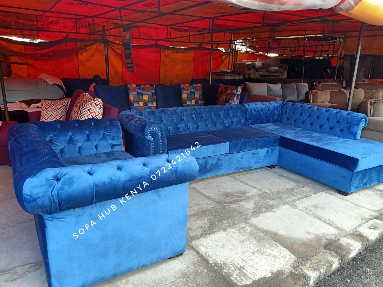 Bring luxury and comfort to your home with this L-shaped Chesterfield sofa, beautifully upholstered in rich royal blue velvet. Designed with the iconic deep-button tufting and rolled arms, this sectional combines classic elegance with modern comfort, making it the perfect centerpiece for any stylish living room. Built by expert artisans at Sofa Hub Kenya, this Chester sofa offers spacious seating, plush cushioning, and a durable hardwood frame for long-lasting quality. The L-shape design fits perfectly into corners, optimizing space while creating a cozy and inviting lounge area. Whether you’re furnishing a new home, apartment, or office lounge, this Chesterfield sofa adds a touch of sophistication and class that never goes out of style. Key Features: Design: L-Shaped Chesterfield Sectional Upholstery: Premium royal blue velvet fabric Frame: Strong hardwood construction Comfort: Deep cushioning for luxurious comfort Detailing: Classic deep-button tufting and rolled armrests Style: Perfect blend of modern and traditional elegance Seating Capacity: 6–7 Seater Made in: Kenya by Sofa Hub Kenya