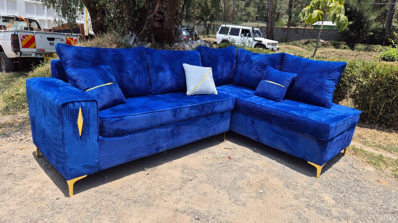 Bring a touch of luxury and bold style to your home with this Royal Blue L-Shaped Sofa, designed for modern living spaces in Nairobi and Kajiado County. Crafted for both comfort and elegance, this sectional sofa blends perfectly into apartments, townhouses, and family homes — offering a stylish centerpiece for your living room. Product Features 💙 Striking Royal Blue Design: The deep blue velvet-like fabric adds a rich, modern flair that stands out beautifully in any home decor. 🛋️ Space-Saving L-Shape: Perfect for both small and spacious living rooms, maximizing seating while maintaining a clean, modern layout. 🌟 Premium Comfort: Plush cushions and high-density foam provide lasting support for relaxation, family time, or entertaining guests. 💪 Durable Build: Strong wooden frame and elegant gold legs ensure long-lasting stability and a luxurious finish. 🧼 Easy to Maintain: The high-quality fabric is resistant to wear, easy to clean, and ideal for everyday use. Why You’ll Love It Perfect for young professionals, new homeowners, and stylish families, this sofa is a blend of modern design and everyday comfort. Whether you’re in Ngong, Kitengela, Ongata Rongai, or Nairobi, this L-shaped sofa will elevate your living experience with elegance and practicality. Perfect For Modern apartments and homes in Kajiado and Nairobi County Urban lifestyles seeking style, comfort, and functionality Anyone who loves a bold, contemporary living room centerpiece